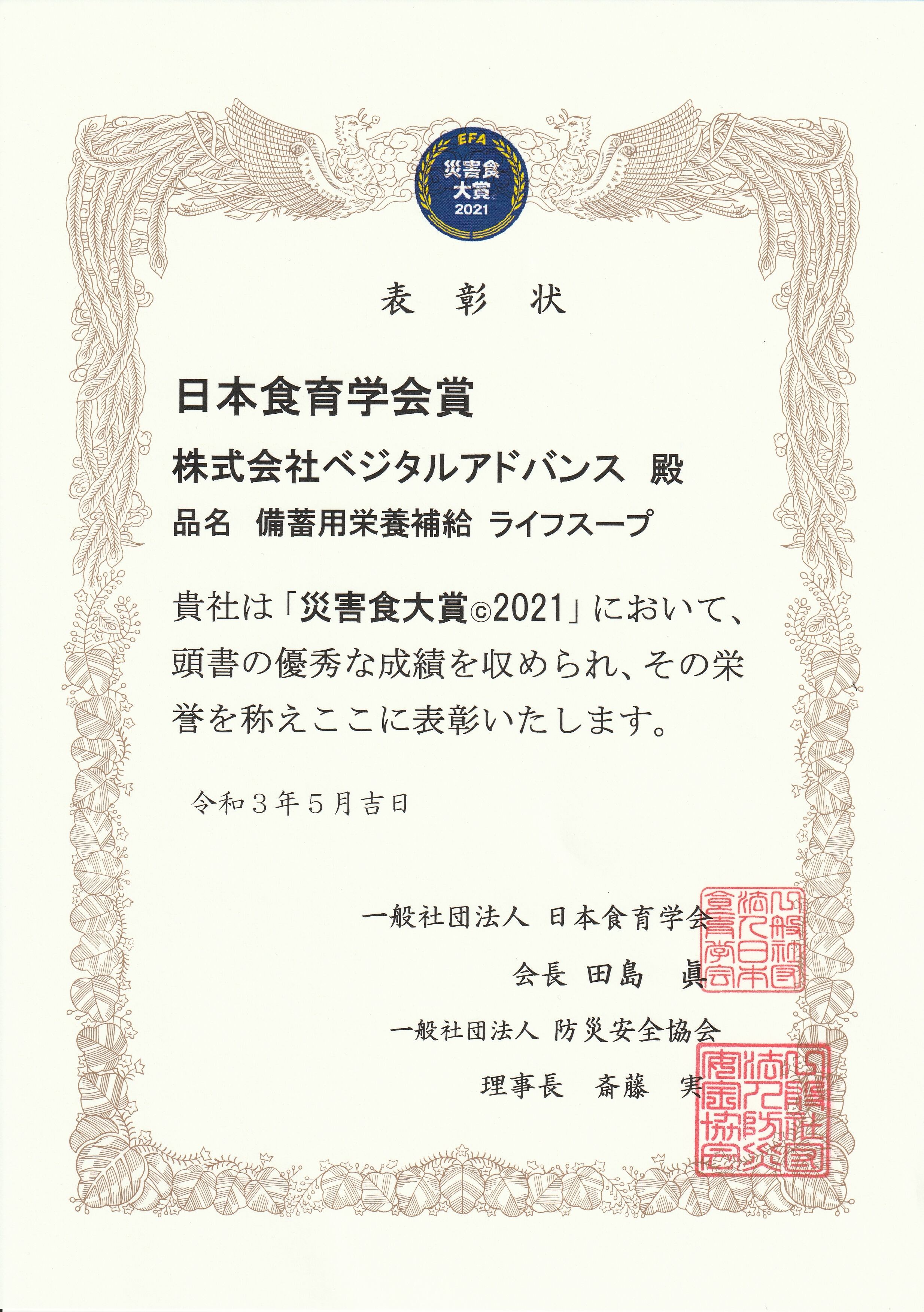 ● 食料備蓄は単に「空腹を満たせればいい」というわけではなく、「栄養を管理できる備蓄」が必須条件です。「ライフスープ」は被災時の健康維持に必要な11種ビタミンと2種ミネラルの栄養強化し、非常時・災害時でも被災者の栄養バランスを整え健康維持を目的とした栄養機能食品です。
